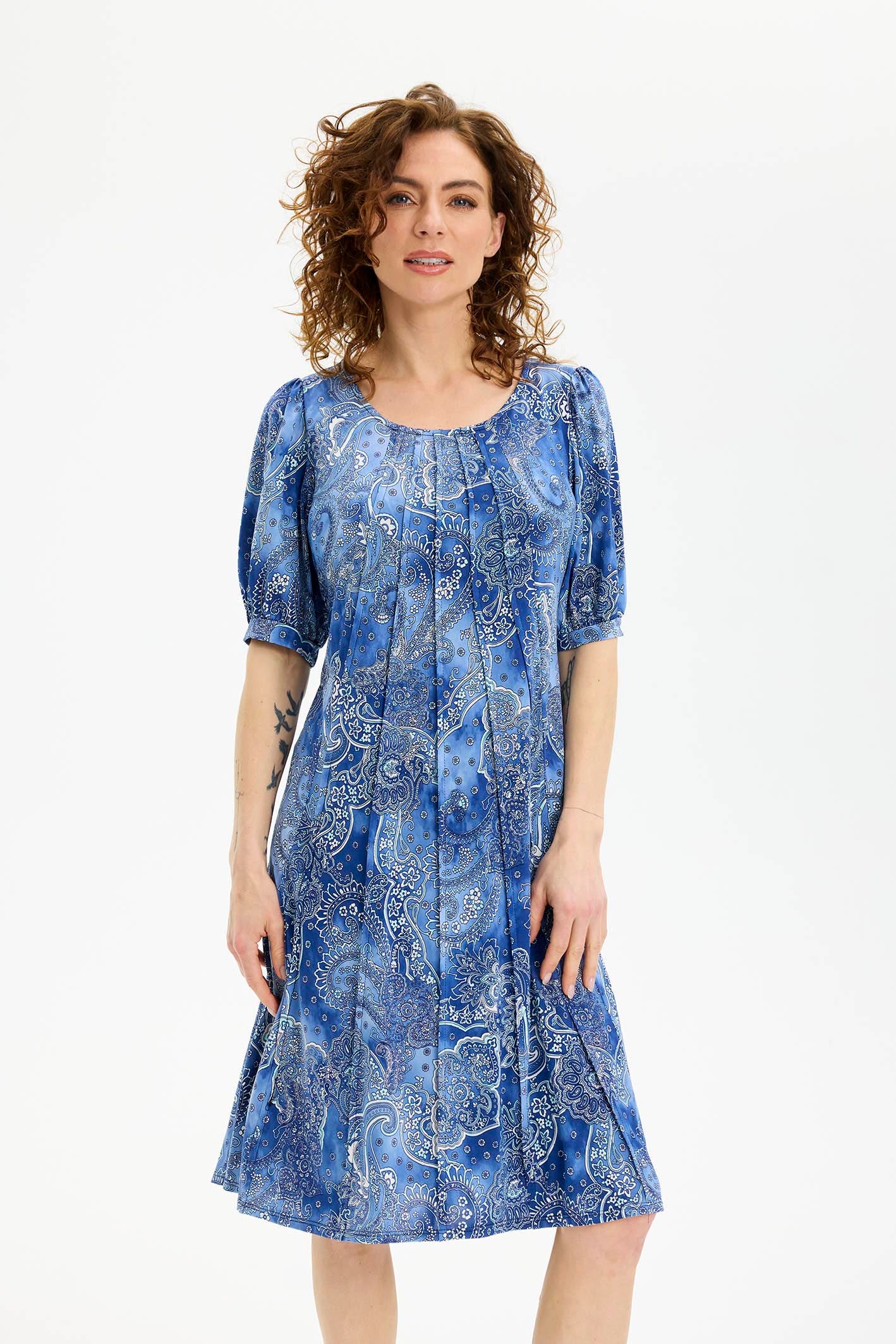 En feminin og elegant kjole i et smukt paisleymønster med blå nuancer, der giver et roligt og stilfuldt udtryk. Den har en rund halsudskæring med små læg, som tilfører ekstra blødhed og bevægelse til designet. Ærmerne er korte med let puf og afsluttes med elastik, hvilket skaber et moderne og velklædt look.